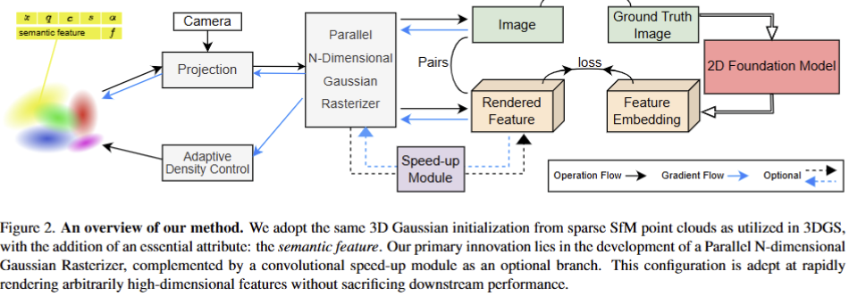 Feature 3DGS는 3D Gaussian Splatting(3DGS)에 고차원 의미 필드를 결합하여, 2D foundation model에서 학습한 의미 정보를 3D 공간에 증류하는 방법을 제안합니다. 이를 통해 3D 장면에서 세그멘테이션, 언어 기반 편집과 같은 의미론적 작업을 가능하게 합니다. 전반적인 파이프라인은 fig 2에서 확인 가능하며 해당 기법은 다음 세 가지 주요 구성 요소로 이루어져 있습니다.