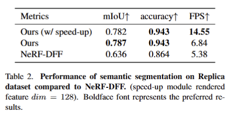 Tab 2에서 보이는 바와 같이 Replica Dataset에서의 세그멘테이션 성능을 보여주며, mIoU 0.782, FPS 14.55로 NeRF-DFF에 비해 향상된 성능을 기록했습니다. Fig 3-(b)에서 NeRF-DFF와 비교한 새로운 뷰에서의 세그멘테이션 결과를 시각적으로 보여주며, 우리의 방법이 더 고품질의 세그멘테이션을 제공함을 확인할 수 있습니다.