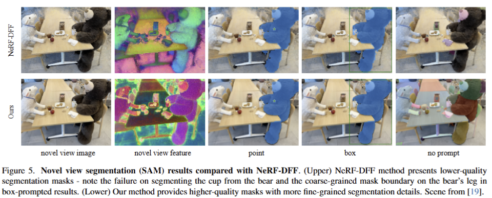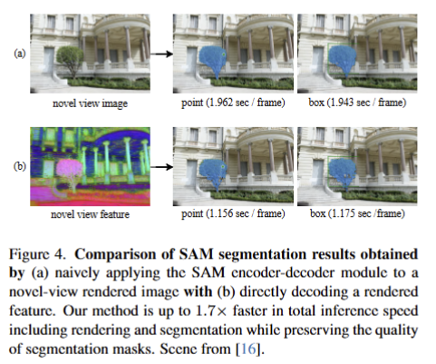 SAM 모델을 사용해 Promptable/Promptless 세그멘테이션을 테스트하였습니다. fig 5에서 박스 프롬프트와 포인트 프롬프트 기반 세그멘테이션에 대한 NeRF-DFF와 비교 가능한 정성적 결과를 볼 수 있으며, Fig 4에서는 단순하게 novel view image에 단순하게 SAM을 적용한 Fig 4-(a)와 저자가 제안한 기법 Fig 4-(b)에 대한 추론 속도에 대한 결과를 확인 할 수 있습니다. 저자가 제안한 방법 1.7배 더 빠르게 수행되었으며, 세그멘테이션 품질을 유지하면서도 속도가 크게 향상되었습니다.
