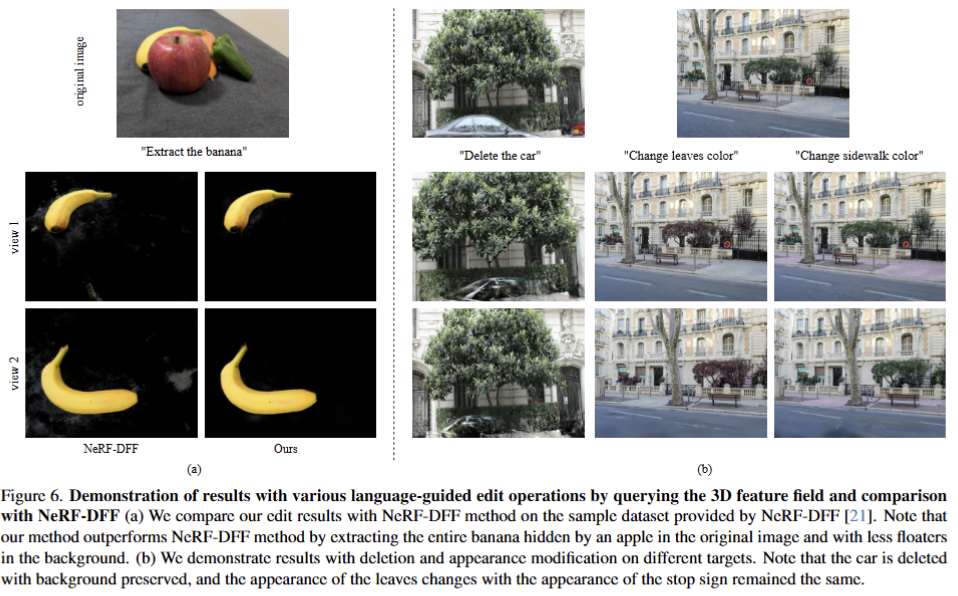 해당 실험에서는 CLIP 텍스트 명령을 통해 객체를 편집하는 작업을 수행합니다. 예를 들어, “바나나 추출”, “자동차 삭제”와 같은 명령을 통해 3D 장면 내 객체를 편집 가능성을 보입니다. Fig 6에서는 NeRF-DFF의 편집 결과를 비교하며, 제안한 기법에서 더 좋은 결과를 보여주고 있습니다.