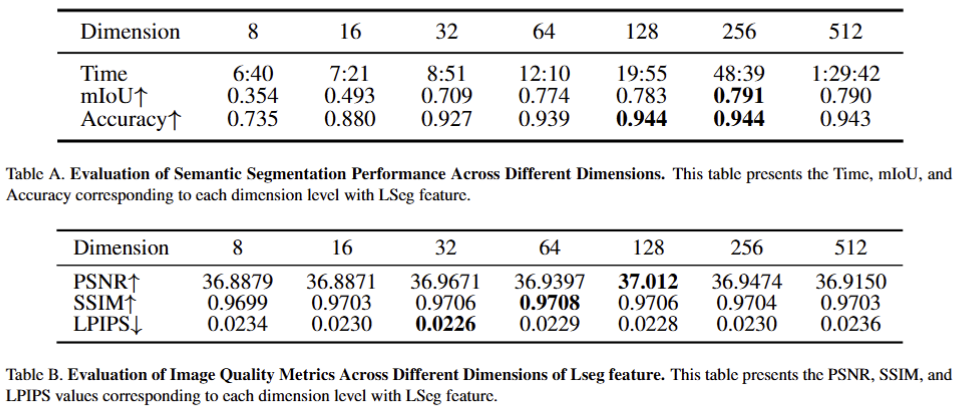 Tab A와 Tab B에서는 Convolutional Speed-Up Module이 각각 LSeg에 대한 distill을 수행 했을 때 성능에 미치는 영향을 결과 입니다. 저자는 128차원으로 다운 샘플링 했을 때, 좋은 효율을 보인다고 주장합니다.