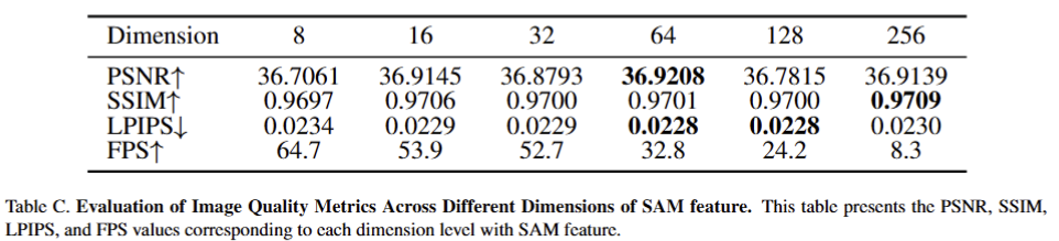 SAM에 대한 증류 결과는 Tab C와 같습니다. 저자는 64차원에서 가장 좋은 효과를 보였다고 합니다. (공평한 비교를 위해 해당 실험을 제외한 모든 실험은 128 차원에서 진행하였다고 합니다.)