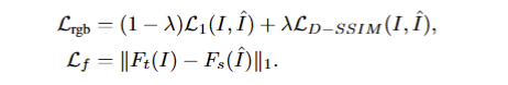 여기서 L_{rgb} = (1 - \lambda) L_1(I, \hat{I}) + \lambda L_{D-SSIM}(I, \hat{I}), L_f = |F_t(I) - F_s(\hat{I})|_1입니다. 여기서, F_t는 foudnation model의 feature map에 해당합니다. 이러한 방식을 통해 고차원 의미 필드와 RGB 이미지를 동시에 최적화하여, 학습 및 추론 속도를 개선하면서도 성능을 유지할 수 있습니다.