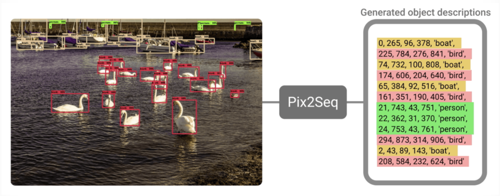 이 모델은 바운딩 박스와 클래스 라벨을 시퀀스로 바꿔서 이 시퀀스를 예측하도록 하였는데, 그림에서 보이는 것과 같이pixel data인 이미지를 입력으로 넣어서 마치 언어 모델이 텍스트를 생성하듯 prediction 결과라 나오는 것을 확인할 수 있습니다. 이와 같이 모델이 discrete token으로 구성된 sequence를 output으로 뱉도록 함으로써 transformer decoder를 사용해 vision task를 수행하는 것입니다.