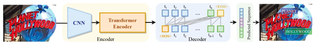 또, sequence generation model의 기존 한계점으로 모델을 학습할 때 maximum sequence 길이를 정해놓고 이보다 더 긴 sequence는 생성하지 못하는 문제가 있었습니다. 즉 모델이 학습한 최대 길이를 초과하는 sequence는 생성할 수가 없다는 것이죠. 이런 limitation은 특히 scene text spotting에서 더 문제가 되는데 object detection에서의 경우를 생각해보면 cat, dog 등의 class가 있다고 할 때 이 각각을 하나의 token으로 삼을 수 있다면 spotting에서는 cat이라는 transcription이 있으면 ‘c’, ‘a’, ‘t’를 하나 하나의 token으로 삼아야 하기 때문에 보다 sequence가 길어질 수밖에 없습니다. 그렇게 되면 document와 같이 한 영상에 text가 엄청 많은 경우에는 모든 text를 읽지 못하게 되겠죠.