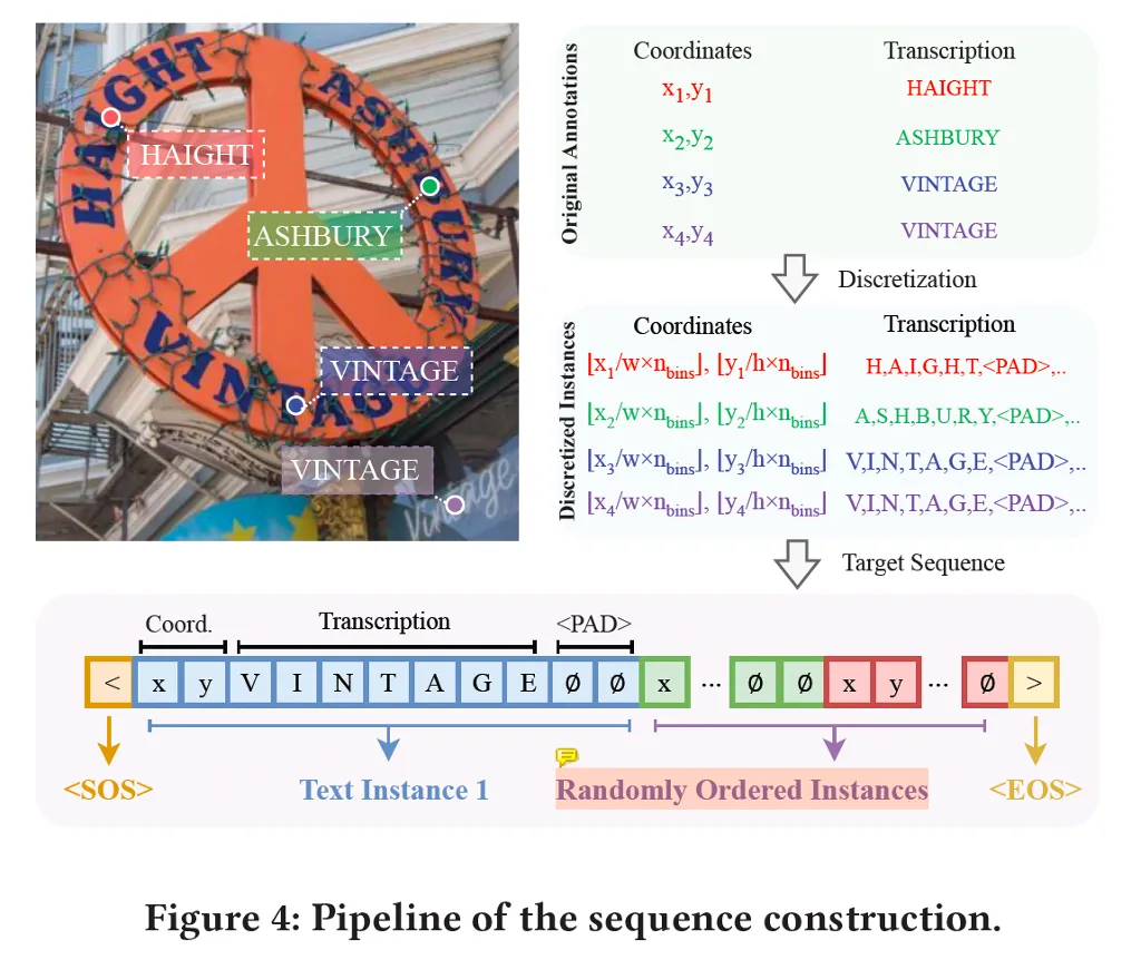 이 SPTS가 sequence를 어떻게 구성했는지 위 그림 4에서 살펴볼 수 있습니다. 먼저 한 영상에 vintage, ashbury 등등의 text instance가 존재할 때 각각의 text instance들의 좌표는 하나의 single point 좌표로 나타내져 있겠구요, 그에 대한 transcription이 있습니다. 이때 sequence generation task로 풀기 위해서는 모든 data가 discrete token으로 표현할 수 있어야 하겠지만 실제로 영상 좌표 같은 경우는 continuous하기 때문에 이를 discrete하게 바꿔주어야 하며, 동시에 각각의 text instance 마다의 길이도 다 다르기 때문에 padding token으로 길이를 맞춰주는 전처리를 수행하게 됩니다.