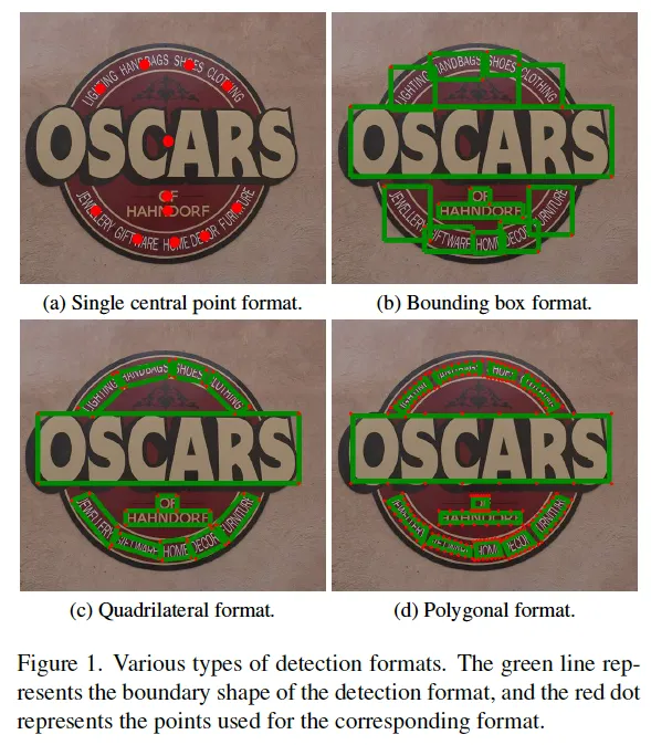 먼저, 그림 1을 보시면 text detection할 때 사용되는 여러 format들을 볼 수 있는데요, text instance의 center 점을 가지고 하나의 좌표로 표현하는 single centeral point format, 일반적인 object detection에서 자주 사용되는 bounding box, 네 꼭짓점 좌표 정보를 담고 있는 quadrilateral 그리고 여러 꼭짓점 좌표 (16개)를 갖는 polygon으로 나뉩니다. 이때 각각의 annotation format들은 cost와 applicability 측면에서 trade off를 갖겠죠. 예를 들어 point 방식은 간단하고 cost가 적게 들겠지만 text의 구체적인 boundary가 필요하거나 위치를 정확하게 파악해야 하는 task에는 적합하지 않겠습니다.