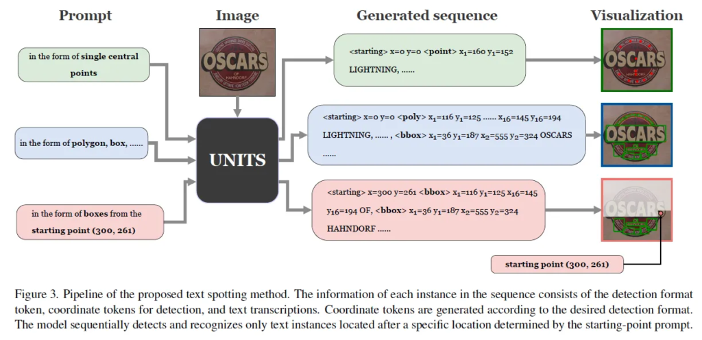 본 논문은 이런 문제를 해결하는 UNIfied scene Text Spotter(이하 UNITS)를 제안하고 있습니다. 이 UNITS는 우선 첫번째 limitation을 해결하고자 다양한 format(point, bbox, quadrilateral, polygon)의 annotation을 통합하여 단일 모델에서 학습할 수 있도록 하였습니다. 또 starting-point prompting 방식을 제안함으로써 기존 maximum decoding 길이를 초과하는 긴 sequence를 생성할 수 있도록 하였습니다. 보다 구체적인 방식은 아래 method 단에서 다루도록 하겠습니다.