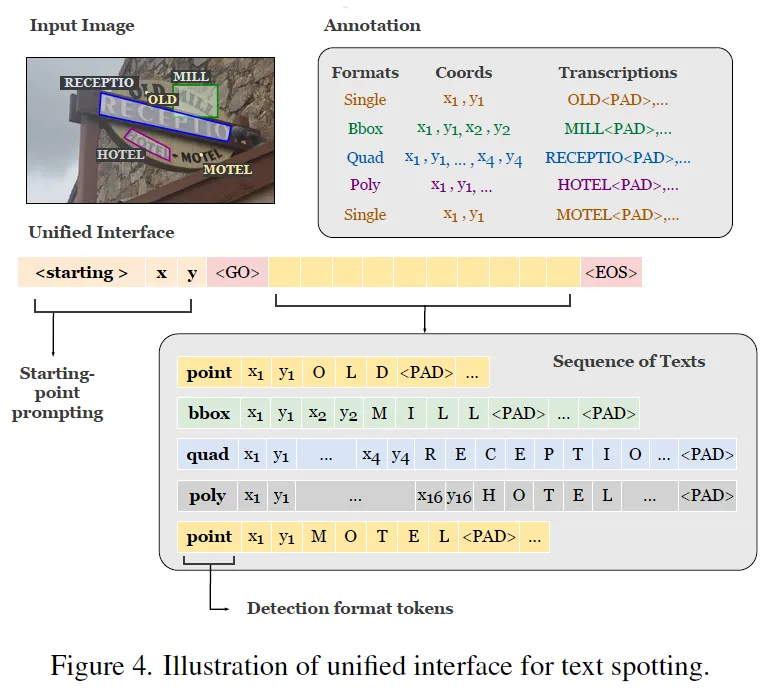 먼저 detection format token인데, 이 token는 하의 모델이 여러 detection format을 사용할 수 있는 용도로 사용이 됩니다. 위 그림 4를 보면 영상에 ‘OLD’, ‘MILL’, ‘HOTEL’ 등 5개의 text가 있을 때 영상 내에서 좌상단 부터 우하단 순으로(보통 사람이 책을 읽는 순) 나열되어 1차원 sequence가 나오게 됩니다. 각 text instance에 대해서 start token이후 맨 앞에 들어가게 되는 <point> <bbox>와 같은 detection format token이 bbox로 표현해야 할지 혹은 그 외의 형식으로 표현해야 할지를 결정하게 되구요 이 detection format token에 해당하는 box annotation이 나오게 됐다면 그 옆에 이어 바로 transcription이 붙게 됩니다. 이런 식으로 sequence를 구성하도록 해서 여러 detection format을 동시에 통합하여 다룰 수 있게 되는 것입니다.