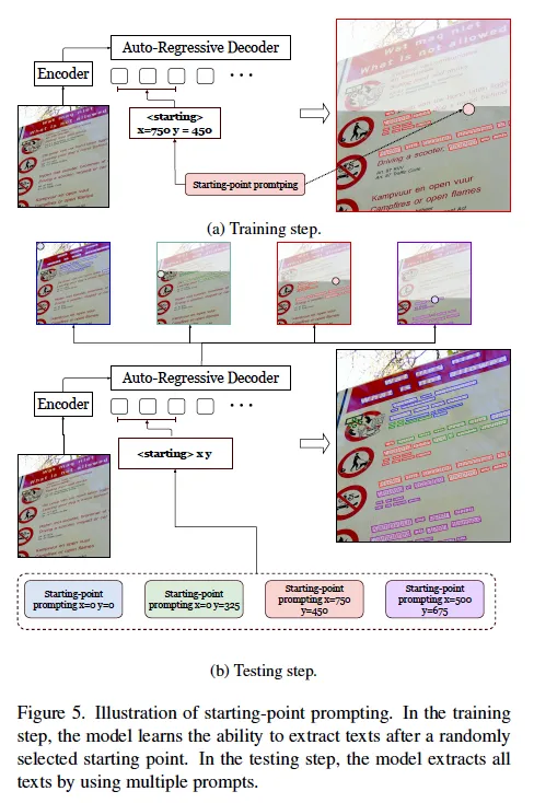 다음은 starting-point prompintg에 대한 설명입니다. 앞서 언급했듯이, 이 방식은 이미지에 텍스트가 너무 많아 모델이 한 번에 모두 예측할 수 없는 경우를 해결하기 위해 제안되었습니다. 모델은 기본적으로 좌상단에서 우하단으로 스캔하면서 텍스트를 읽게 되는데요. 그림 5를 보시면 학습 단계에서는 랜덤하게 시작점을 지정하여, 해당 지점에서 시작해 그 아래로 존재하는 모든 텍스트를 읽도록 학습됩니다. 이렇게 하면 모델이 특정 지점에서부터 시작하는 prediction을 자연스럽게 처리할 수 있게 되죠.