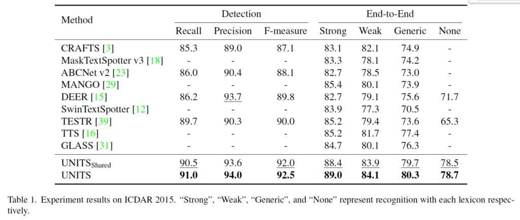 이제 실험 결과를 살펴보도록 하겠습니다. 이 두 테이블은 메인 실험 결과 table로 각각 사각형 형식의 annotation을 갖는 ICDAR 2015데이터셋과 polygon 형식의 어노테이션을 갖는 total text 데이터셋에 대한 실험 결과입니다. 여기서 UNITS shared는 여러 어노테이션 format을 다 합쳐서 사용한 unified model이고 그 아래 그냥 UNITS는 각 데이터셋에 맞게 fine-tuning된 모델입니다. 이 UNITS shared와 fine-tuning한 UNITS 사이를 비교해봤을 때는 역시 데이터셋에 맞게 한 annotation만으로 tuning한 모델이 약간 성능이 더 높은 것을 확인할 수 있습니다. 또, 벤치마크 데이터셋에서 UNITS가 end-to-end 기준 SOTA를 달성한 것을 볼 수 있는데 이로써 본 모델의 사각형과 polygon output이 기존 방법론에 비교했을 때 경쟁력있다고 말할 수 있겠습니다.