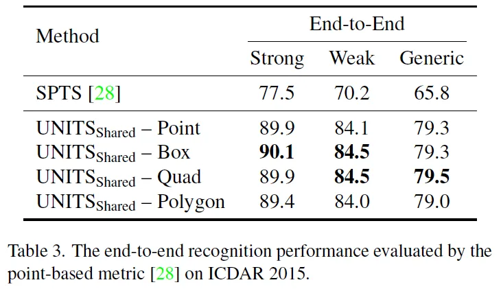 위 table3은 본 UNITS와 동일하게 sequence generation 방법론이면서 하나의 single central point 형식만 사용하는 SPTS에 대한 비교입니다. SPTS가 point 기반의 evaluation metric을 제안하였다고 하여 동일한 metric을 따라 성능을 측정하였다고 합니다. 표를 보시면 UNITS는 single point를 포함하여 box, quadrilateral, polygon format을 output으로 뱉을 수 있는 모델이기에 각각에 대한 성능을 리포팅해두고 있습니다. 모든 output에 대한 e2e 성능을 보면 같은 형식인 poitn와 비교해보았을 때도 제안된 UNITS가 훨씬 좋은 성능을 보이고 있으며 그외의 format도 그와 유사한 양상을 띕니다.