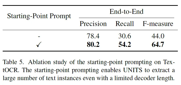다음은 starting point prompting에 대한 ablation study입니다. 본 방식은 decoder의 길이가 제한되어 있을 때 이 길이를 초과하여 더 많은 text instance를 detection하고 recognition할 수 있게 도와주는 방법이었는데, 이에 대한 효과를 확인하기 위해 UNITS 모델을 starting point prompting을 사용하지 않았을 경우와 사용했을 경우의 성능을 비교해보았습니다. 이 실험은 상대적으로 text instance를 많이 포함하고 있는 데이터셋인 TextOCR 데이터셋에서 수행이 되었고 이때 사용한 format으로는 single poitn를사용하도록 해서 베이스로 삼았던 모델 SPTS와 유사하도록 하였습니다. 결과를 보시면 starting prompting을 사용하면 model의 recall이 엄청 향상된 것을 확인할 수 있는데, 이는 sequence lengh의 한계를 넘어 더 많은 instance를 검출할 수 있기 때문이라고 볼 수 있겠습니다.