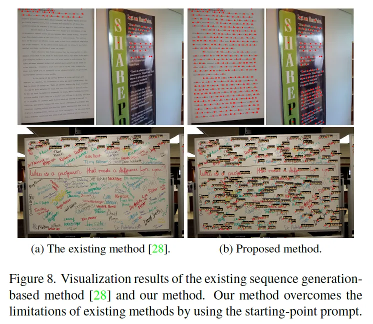 위 Fig8의 정성적인 결과에서도 볼 수 있듯이 starting prompt가 없는 경우에는 수많은 text instance를전부 검출해내지 못하고 있으며 제안된 방식은 전체를 다 검출하고 있음을 보여줍니다.
