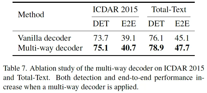 마지막으로 multi-way transformer decoder에 대한 ablation study입니다. 저자가 여러 decoder format의 sequence를 generation해야 함을 고려하여 transformer decoder에서 attention까지는 공유하고 FFN을 detection expert, recognition expert로 나눠 사용하도록 했었는데요. 이의 효용성을 확인하기 위해 vanilla decoder를 사용했을 경우와 비교를 해 보았습니다. 위 표7을 보시면 결과가 나와있는데, multi-way decoder를 사용했을 때 vanilla에 비해 detection과 e2e 성능이 많이는 아니지만 약간 상승한 것을 볼 수 있습니다. 엄청난 성능 향상이 있지는 않지만 이 multi-way decoder를 사용했을 경우에 각각의 expert가 detection token, recognition token을 생성하도록 함으로써 수렴 속도가 더 빠르기 때문에 사용하는 것이 이점이라고 볼 수 있겠습니다.
