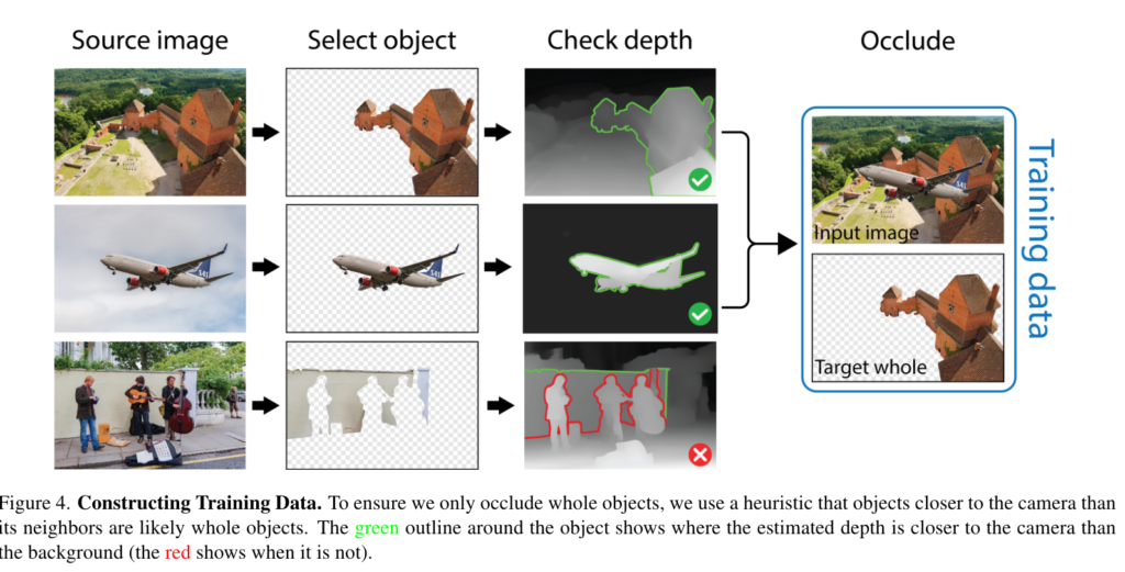 Segment Anything과 MiDaS를 활용하여, SA-1B 데이터셋에서 물체 후보를 찾고, 온전한 물체를 선택합니다. 이 과정을 통해, 각 이미지에서 온전한 물체가 포함된 경우 해당 물체를 가리는 방법으로 837,000장의 이미지 쌍을 가진 데이터셋을 구축했습니다.