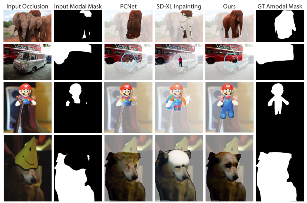 이 모델의 목표는 부분적으로 가려진 물체가 포함된 RGB 이미지와 프롬프트를 입력받아, 가려진 물체의 전체 형상과 외형을 예측하여 새로운 이미지를 생성하는 것입니다. 입력으로 주어진 프롬프트는 관심 물체의 위치나 형태를 나타내는 마스크 혹은 점로 주어지고, 생성된 이미지는 물체 전체만 표현된 형태이며, 배경이나 다른 요소는 배제됩니다.