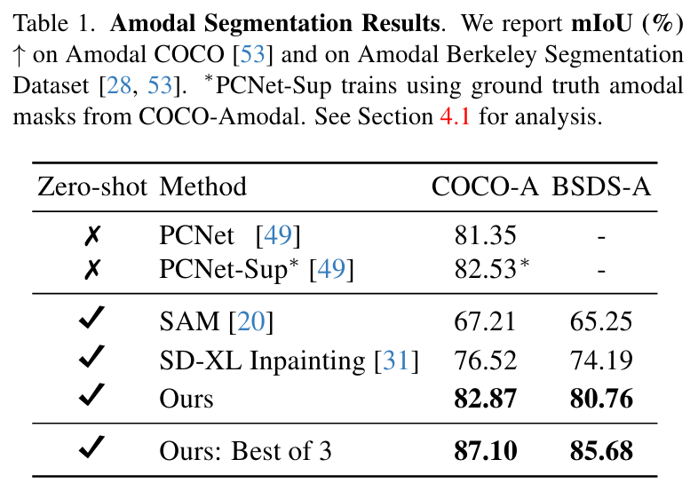 먼저 Amodal segment의 경우 COCO-A, BSDS-A로 PCNet, SAM, Stable Diffusion XL 모델과 비교했는데, 위의 Table1에서 볼 수 있듯 제로샷 환경에서 기존의 모델들의 mIOU를 모두 능가하는 성능을 보였으며, 아래 Figure6과 같이 결과물 자체에 비현실 적인 부분이 훨씬 적을 뿐 만 아니라, 전체 적인 모양을 훨씬 더 잘 예측하는 모습을 보였고, 이를 통해 기존의 Stable Diffusion 모델보다 더 적은 데이터로 학습했을지언정 Fine Tuning하는것이 중요하다는 점을 알 수 있다고 합니다. 이렇게 놓고 보니 엄청 차이가 많이 나긴 하는 것 같습니다. Best of 3는 무슨 의미가 있는지 잘 모르겠습니다..