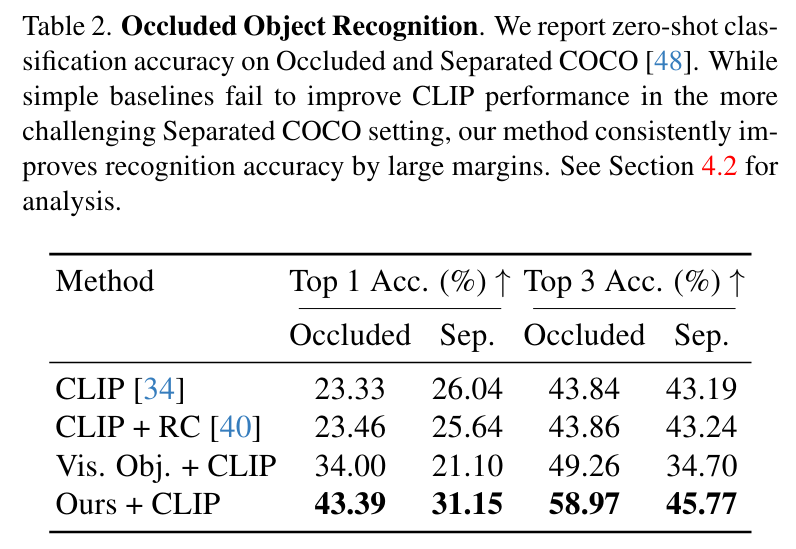 Occluded Object Recognition의 경우에는 복원된 결과를 CLIP을 open vocabulary classifier로 사용해 클래스를 구해 평가했고, Occluded COCO와 Seperated COCO 데이터셋을 사용했다고 합니다. 가려진 물체 주변을 빨간 원으로 시각적 프롬프팅 하는 방법(RC)과 가려진 물체 외의 모든 부분을 마스킹 한 경우 (Vis. Obj.), 이미지 자체를 CLIP에 전달하는 경우와 비교했을 때 훨씬 우수한 성능을 Table2와 같이 보인다고 합니다. 하지만 별다른 비교 모델이 없는 것 같은 점이 아쉬웠고, Top-3안에 정답이 있는 경우는 Top-1에 있을 때 보다 격차가 많이 줄어드는 모습을 볼 수 있었습니다.
