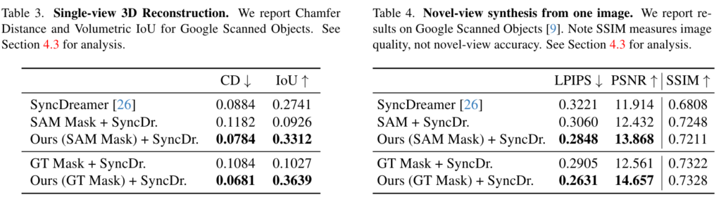 Amodal 3D Reconstruction 같은 경우는 Novel-view synthesis와 single-view 3D reconstruction으로 나누었습니다. single view인 경우 3D생성 모델인 SyncDreamer에 모든 전경 물체의 segmentation을 입력으로 제공했을 때, SAM 마스크를 활용했을 때, 저자의 모델을 입력으로 사용했을 때를 비교했을 때 Table3와 같이 Chamfer Distance(실제 pointcloud와의 거리 차)는 더 낮고 IoU는 더 높았다고 합니다. Novel-view인 경우에도 같은 비교군을 통해 PSNR, SSIM, LPIPS를 비교했습니다. PSNR (Peak Signal-to-Noise Ratio)는 생성된 이미지와 실제 이미지 간의 유사성을 측정하는 지표로, 값이 높을수록 정확한 복원을 의미합니다. SSIM (Structural Similarity Index)는 이미지의 구조적 유사성을 평가하며, 값이 높을수록 시각적 일관성이 뛰어남을 나타냅니다. LPIPS (Learned Perceptual Image Patch Similarity)는 인간의 시각적 유사성을 더 잘 반영하는 지표로, 낮을수록 두 이미지 간의 유사성이 높음을 의미합니다. Table4와 같이 생성된 이미지와 실제 이미지가 구조적으로 더 유사하고 인간의 시각적 유사성을 더 잘 반영했습니다. 아래의 Figure 10인 정성적인 결과물은 정말 훌륭한 것 같습니다..