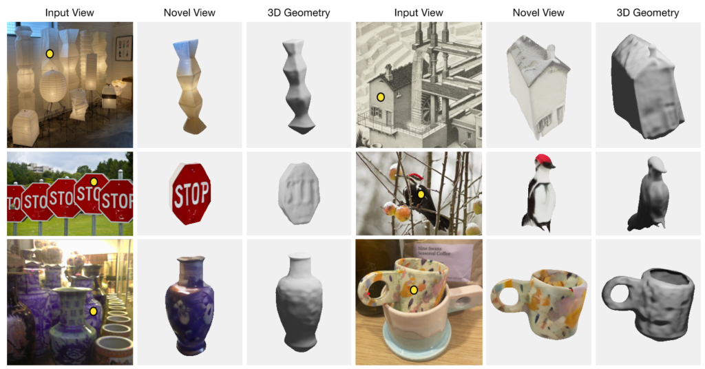 마지막으로 Novel-view synthesis는 한 이미지로 주어진 물체가 다른 각도에서는 어떻게 보일지 예측하는 것이고, single-view 3D reconstruction같은 경우는 한 이미지로 주어진 물체의 완전한 3D 형상을 복원하는 것입니다.