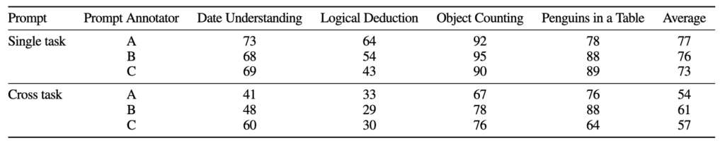 CoC는 서로 다른 프롬프트를 통해 동일한 문제 세트에 대해 독립적으로 작성된 3명의 annotator가 제공한 프롬프트로 평가함으로써, 일반적으로 프롬프트 변형에 강한 성능을 보인다는 것을 보여주었습니다. 특히, 새로운 코드 생성을 요구하는 BIG-Bench Hard에서 네 가지 대표적인 task를 선택했습니다(반복 코드가 아니고 매번 새 코드를 생성하는 태스크였습니다). 개별 task의 성능은 다소 변동이 있지만, 4개의 task의 평균 성능은 몇퍼 정도의 오차만 있었습니다.