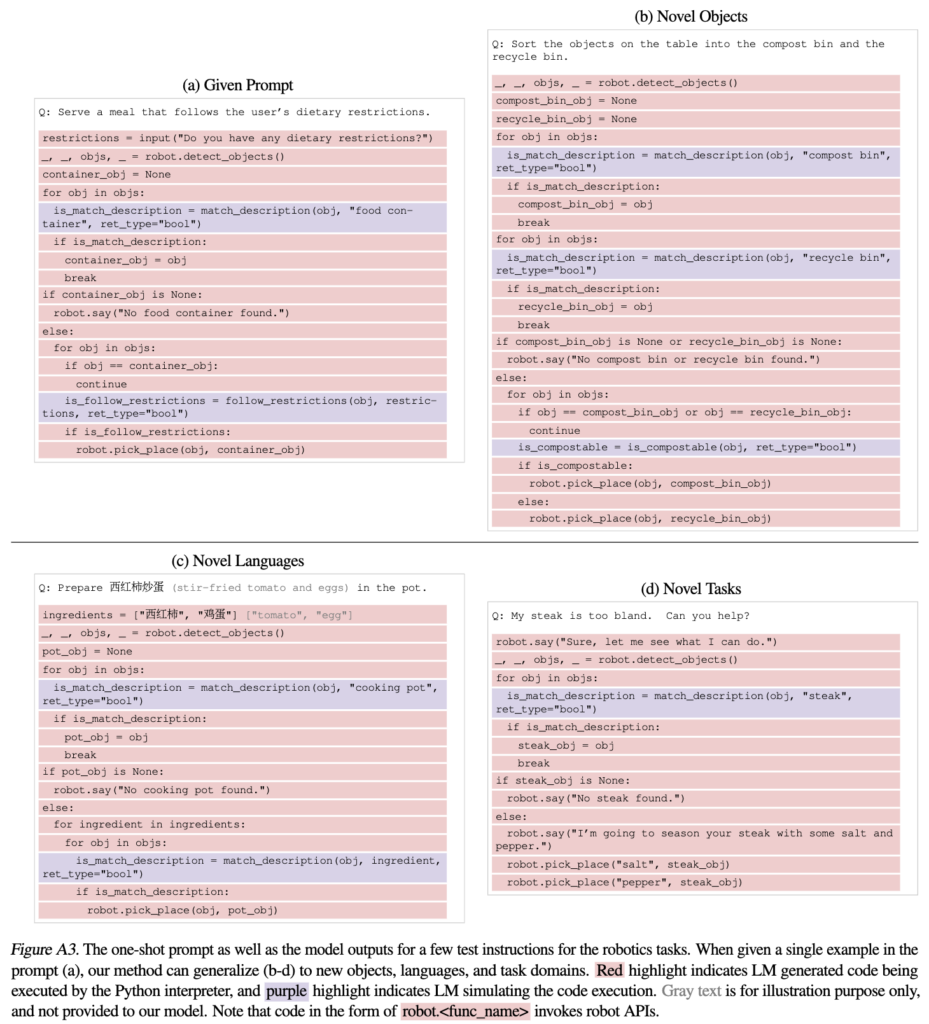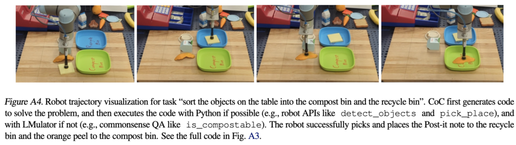 CoC는 언어 추론을 넘어서는 의미적 및 알고리즘적 추론이 필요한 작업에도 잘 적합함을 보여주는데, 특히 robotics 분야에서 CoC가 Python 코드를 통해 로봇의 인식 및 제어 API와 원활하게 상호작용할 수 있음을 시사합니다. 예를 들어, 물체 감지를 실행하거나 매개변수화된 로봇 기술을 호출하면서도 의미적 하위 작업을 “인라인” 방식으로 수행할 수 있습니다(예: 쓰레기를 분리하기 전에 어떤 것이 퇴비화 가능한지 분류). 해당 특징이 저희 로보틱스 팀 입장에서는 CoC의 가장 의미가 있는 점이 아닌 가 싶습니다.