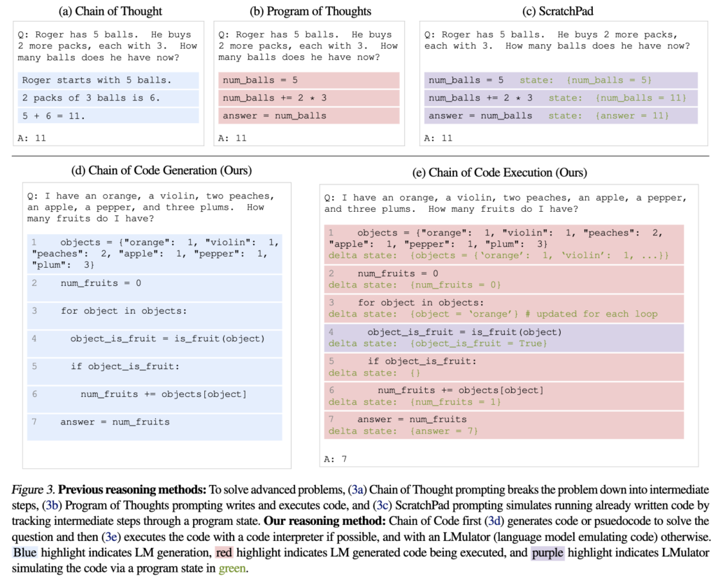 CoC는 주어진 문제를 해결하기 위해 문제를 추론하는 코드를 단계 별로 생성합니다. 명시적 코드, 의사코드 또는 자연어 형식으로 제공될 수 있으며, 문제를 해결하기 위한 사고 과정의 틀을 제공합니다. 예를 들어, BIG-Bench의 객체 수 계산 문제를 해결하는 과정이 위 그림 3d에 해당합니다.
