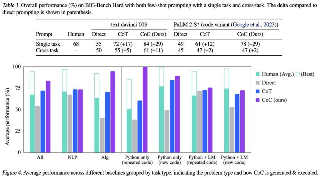 역시나 Python에서 입력만 다르고 반복 코드로 실행될 수 있는 과제에서는 CoC가 거의 100%에 가까운 정확도를 기록했습니다. 이러한 과제(예: 다단계 산술 문제)는 다른 기준 모델이나 인간 평가자에게는 특히 어려운 과제로 평가되었습니다. CoC에 더 도전적인 범주도 있었으나, 이 경우에도 CoC는 기준 모델들보다 우수한 성능을 유지했습니다.