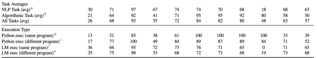 우선 1에 대한 결론은 사실 위 그림 속 table1 과 같습니다. 전체적인 세부 태스크들에 대해서는 Appendix의 A1에도 나와있는데요. CoC는 여러 태스크들에서 좋은 모습을 보이면서 모든 태스크들의 성능을 평균 낸 Single Task에서 Human의 성능의 평균치보다 더 좋은 결과(+29)를 보여주었습니다. text-davinci-003 모델 대신 GPT-4와 결합할 경우는 91까지 향상된다고 합니다. 특히 몇몇 태스크들(특히 알고리즘적 태스크)에서는 거의 100%에 가까운 성능을 보여줬습니다. 하지만 Single Task가 Human을 제친 것은 사실 모든 태스크들에 대한 평균치였던 것이고, Causal Judgement나 Ruin Names, Formal Fallacies 등에서는 Human과 CoT보다 낮은 결과도 보여줬었습니다.