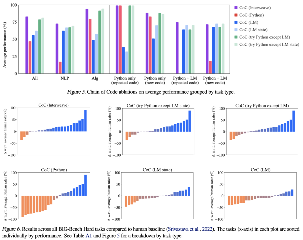 위의 Figure 4와 Table A1에서는 CoC의 성능을 크게 ALL, NLP, Alg(알고리즘) 으로 나누었습니다. 역시 코드 기반인지라 CoC는 알고리즘적 태스크에서 CoT(71)에 비해 Inter-weave(95)라는 월등히 높은 성능을 가져옵니다. NLP 태스크에서도 기존의 성능을 유지하는 경향을 보여주었구요. 이는 코드 기반 접근이 언어 중심의 문제에 적합하지 않을 것이라는 예상을 뒤집는 긍정적인 결과였다고 합니다. CoC의 핵심은 LMulator를 사용해 코드 실행 결과를 시뮬레이션함으로써, 자연어 문제에서도 언어 모델의 의미적 추론 능력을 유지할 수 있다는 점에 있었다고 할 수 있겠습니다.