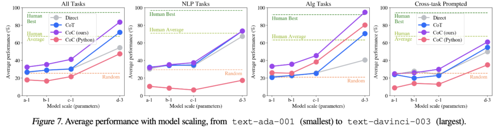 여기선 언어 모델에 다양한 문제의 예시를 제공했습니다. 그림 7과 표 1에 따르면, 모든 접근법에서 성능이 감소했지만, CoC는 대규모 모델에서도 CoT와 직접 프롬프팅보다 우수한 성능을 보여주며 human 평균 성능에 거의 도달했습니다. 이는 동일한 유형의 예시가 제공되지 않는 일반적 추론 작업에서도 CoC가 효과적일 가능성이 있다고 볼 수 있겠습니다.