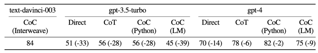 - gpt-3.5-turbo: CoT와 CoC (Python) 모두 Direct보다 성능이 우수, but CoC (Interweave)가 훨씬 더 뛰어남.