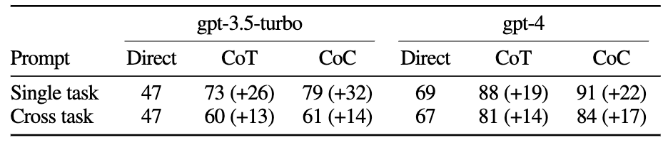 유저 쿼리로는 single task 혹은 cross task 도메인의 3가지 예시와 함께 질문을 포함하여 text-davinci 모델을 평가할 때와 동일하게 구성했다고 합니다. 결과는 CoC가 Direct 및 CoT 기준 모델보다 여전히 상당한 성능 향상을 보였습니다. gpt-4에서는 기본 모델의 성능이 이미 높아 개선의 여지가 적어 성능 격차가 다소 줄어들었습니다. 이 실험의 의의로는 CoC를 gpt-4와 같은 고급 instruction tuned 모델과 결합할 수 있는 실질적인 방법을 제안했다는 점의 의의가 있을 것 같습니다.
