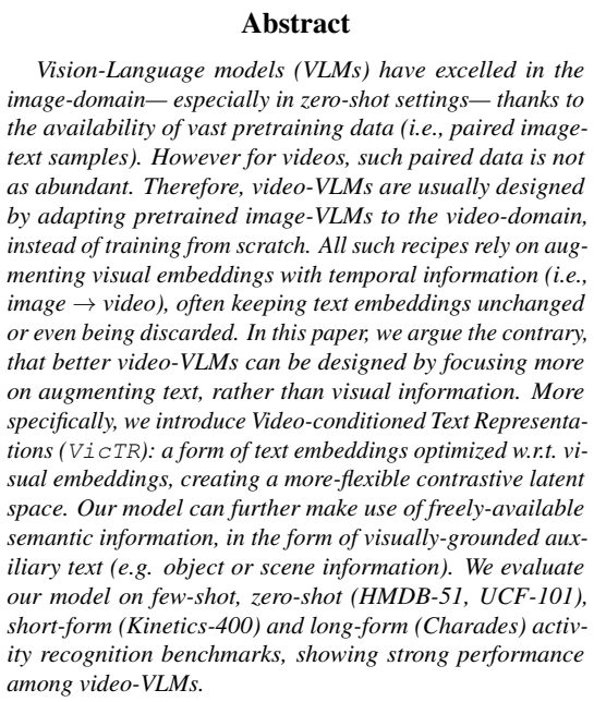 안녕하세요, 이번 주 X-Review에서는 24년도 CVPR에 게재된 논문 <VicTR: Video-conditioned Text Representation for Activity Recognition>을 소개해드리겠습니다. 잘 편집되어있는, 즉 하나의 비디오에서는 하나의 action만 등장하는 trimmed video에서 어떠한 action이 등장하는지 분류하는 Activity Recognition (AR) task를 수행하는 논문입니다.