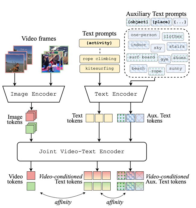 위 그림 2는 저자가 제안하는 방법론 VicTR의 간단한 구조도입니다. 현재 보고있는 비디오와, 텍스트 토큰 간 유사도를 기반으로 텍스트 토큰을 새롭게 갱신하게 되고, 이를 통해 비디오 내 발생하고 있는 action을 분류하는 것이 방법론의 큰 컨셉입니다. 이제 자세한 내용을 알아보도록 하겠습니다. 그림 2에 나타나있는 Auxiliary Text prompts는 추가적인 LLM이나 모델을 가져와 뽑은 것은 아니고, 그냥 데이터셋 annotation에서 바로 얻을 수 있는 텍스트 단어들을 가져온 것이라고 합니다. 아무래도 Real-world에서 사용하긴 좀 어려운 부분이라고 볼 수 있겠네요. 일종의 성능 향상을 위한 추가 정보에 해당합니다.