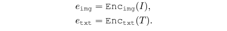 본 task에서 텍스트는 잘 갖춰진 문장이 아니기에, CLIP과 동일하게 “a photo of {class}.”와 같은 프롬프트로 감싸집니다. 이후 BPE (Byte Pair Encoding) 기법을 통해 토큰 단위로 전처리된 후 트랜스포머 기반의 {Enc_{txt}}에 입력되며, 전처리 과정에서 붙은 [EOS] 토큰을 {e_{txt}}로 두게 됩니다. 위 과정은 아래 수식과 같습니다.
