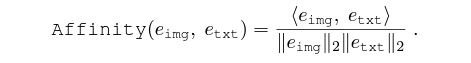 이후엔 두 모달리티의 최종 feature 간 유사도를 조정해줍니다. 아래 수식과 같이 유사도를 구한 뒤 일치하는 쌍이라면 유사도를 높게, 아니라면 유사도를 낮추도록 학습합니다. 아래 수식과 같이 추후 본 논문에서 언급하는 affinity는 cos 유사도를 의미합니다.