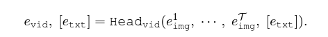 이제 위 모델을 비디오에 적용해야 합니다. 기본적인 인코더들과 학습 방식은 변할 것이 없지만, 아무래도 입력 자체가 이미지에서 비디오 V \in{} \mathbb{R}^{\mathcal{T} \times{} H \times{} W \times{} 3} = [I^{1}, \cdots{}, I^{\mathcal{T}}]로 변경된다는 점이 가장 크겠죠. 우선 총 \mathcal{T}개의 각 프레임은 기존과 동일하게 이미지 인코더를 통과하게 되고, 이렇게 얻은 각 프레임별 {e_{img}^{i}}는 텍스트 인코더와 concat되어 Video Head {Head_{Vid}}를 거치게 됩니다. 이는 아래 수식과 같습니다.