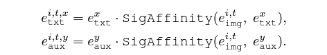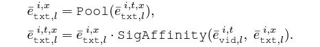 i번째 비디오의 t번째 프레임의 클래스 x에 대한 텍스트 토큰 e_{txt}^{i, t, x}를 만들어주기 위해 프레임과 텍스트 간 cos 유사도에 Sigmoid를 태워 이 값을 다시 텍스트 토큰에 곱해주는 것입니다. Aux 토큰들에 대해서도 마찬가지로 만들어내줄 수 있습니다.