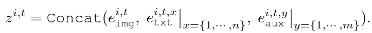 총 n개의 단어 (데이터셋의 라벨 activity classes)로 구성된 텍스트 [T^{1}, \cdots{}, T^{n}], 또 데이터셋에서 가져올 수 있는 m개의 auxiliary semantic categories [A^{1}, \cdots{}, A^{m}]이 존재합니다. 각각의 embedding은 \{e_{txt}^{x} | x = 1, 2, \cdots{}, n\}, \{e_{aux}^{y} | y = 1, 2, \cdots{}, m\}으로 표현할 수 있습니다. \mathcal{T}개 프레임으로 구성된 i번째 비디오 V^{i}의 임베딩은 e_{img}^{i, t} | t=1, 2, \cdots{}, \mathcal{T}에 해당합니다.