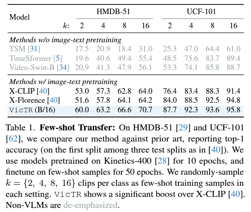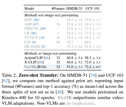 표 1, 2는 각각 Few-shot, Zero-shot 상황에서 HMDB, UCF 두 데이터셋에 대해 측정한 성능입니다. 표에서 VLM 기반이 아닌 방법론들은 회색으로 처리되었습니다. 저자가 뚜렷한 분석을 하고있진 않은데, 우선 Zero-shot 성능도 높지만 Few-shot에서의 기존 방법론 대비 성능 향상 폭이 뚜렷합니다. 이는 VicTR이 few-shot 학습 중 보는 것이 굉장히 큰 도움이 됨을 의미하는데, 학습 과정에서 비디오의 영향을 받은 텍스트 토큰을 만들어낸 다는 점이 유효하게 작동했음을 알 수 있었습니다.