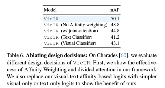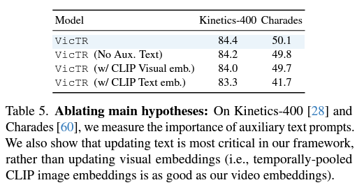 표 5, 6에선 VicTR의 핵심 contribution에 대한 ablation 성능을 보여주고 있습니다. 표 5에서 우선 데이터셋으로부터 얻을 수 있는 Auxiliary token을 추가적으로 활용했을 때 성능이 오른 것을 통해, 이러한 semantic의 잠재력을 보여주고 있다고 이야기합니다. 사실 이 부분은 데이터셋에서 가져오든 LLM을 통해 추출하든 이 추가 정보를 어떻게 활용할지가 성능 변동에 더 크게 관여할 것 같네요. 또한 텍스트 임베딩을 갱신해서 활용해야하고, 더 나아가 VicTR과 같이 만들어주는 것의 효과를 볼 수 있습니다. 텍스트를 활용하지 않는 경우 두 데이터셋에서 각각 -1.1%, -8.4%의 mAP 하락을 불러왔습니다.