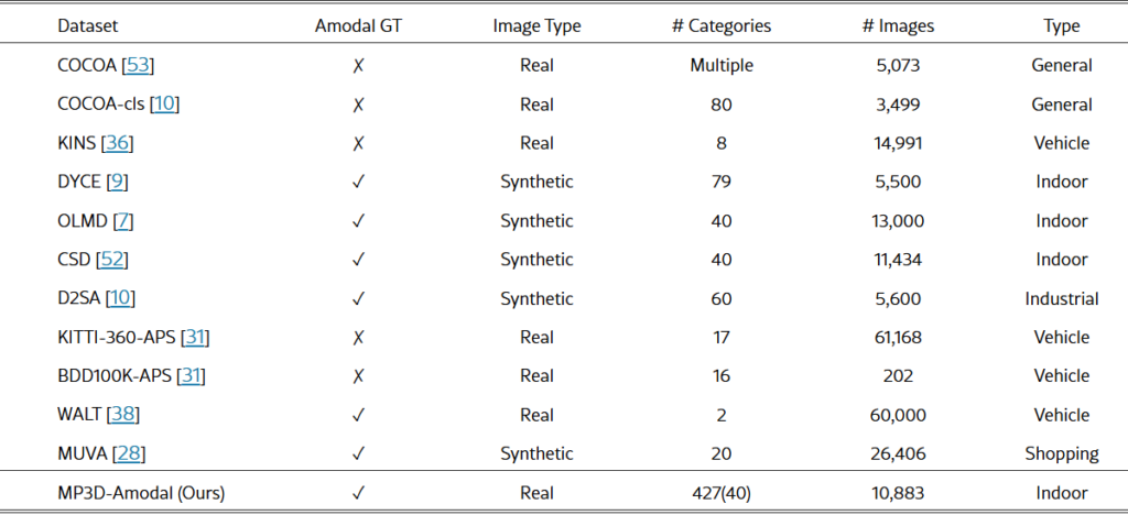 다른 Amodal Completion 논문들의 저자와 같이 해당 논문의 저자는 Mask-RCNN, SAM 같은 모델들이 나오면서 Instance Segmentation 분야가 매우 발전했지만, 모두 Amodal Segmentation을 수행할 때는 한계를 가지고 있다는 문제를 정의합니다. Amodal Segmentation을 성공적으로 수행한다면, Object Detection, 3D Reconstruction, Manipulation 및 Navigation Task Planning 등 여러 분야에서 응용해서 유용하게 사용될 수 있을 것이라는 점을 어필했습니다. 그러고 이 Amodal Segmentation의 큰 도전과제를 3D세계에 존재하는 다양한 객체들이 2D로 투영될 때 생기는 복잡한 occlusion과 아래 표에서 알 수 있듯 기존 Amodal Segmentation Dataset이 synthetic 데이터라는 점을 한계로 정했습니다. 이 문제를 해결하기 위해 MP3D-Amodal Dataset을 새로 만들었고, 이 데이터 셋은 Real Image 기반 Authentic Ground Truth Amodal Mask를 제공한다고 합니다. 데이터셋을 만들 때는 MatterPort3D 데이터셋의 3D 구조를 2D로 투영해서 생성했습니다. 또한 Amodal Segmentation을 위한 새로운 모델인 OccAmodal, SDAmodal을 제시했는데, SDAmodal 같은 경우는 이름에서 알 수 있듯 다른 Amodal Completion 모델들과 같이 Diffusion을 사용했습니다. 아무래도 Diffusion이 제일 성능이 좋은 것 같습니다. 또 SDAmodal의 경우 다른 Diffusion을 사용한 모델들도 비슷할 것 같긴 한데 Class-Agnostic하게 작동하고, Occluder Mask가 제공되지 않는 경우에도 성능을 발휘한다고 합니다.