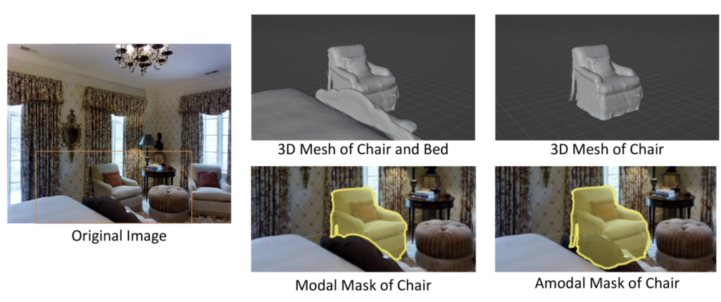이 데이터셋은 MatterPort3D 데이터셋의 3D Mesh와 Real Image를 활용하여 Amodal Mask와 Modal Mask를 생성하는 과정을 자동화했습니다. Modal Mask는 객체가 현재 보이는 영역만을 표현하는 마스크이고, 따라서 Modal Mask를 만들 때 특정 scene의 모든 객체를 3D Mesh로 표현한 후, 이를 전부 카메라 공간으로 투영해 2D 이미지를 얻어서 각 객체들의 Modal Mask를 구한다고 합니다. 아래 그림과 같은 마스크를 얻을 수 있습니다.