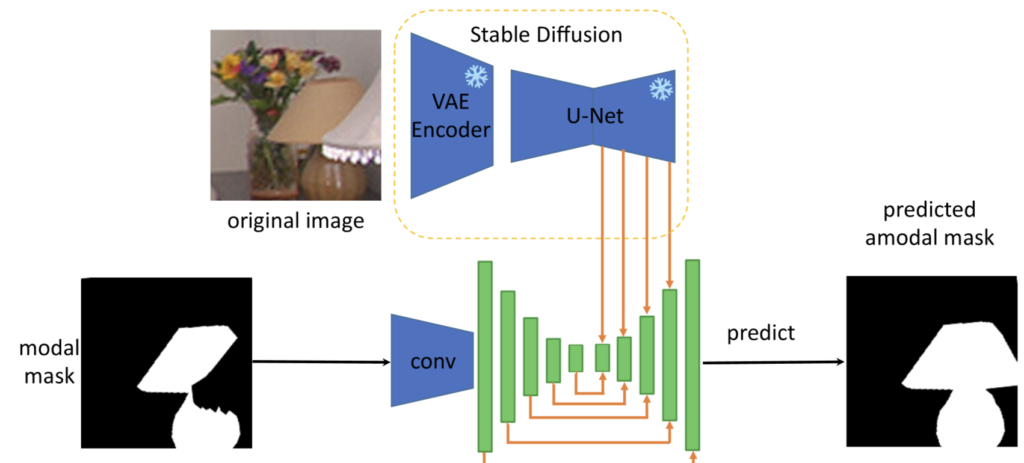 SDAmodal은 Stable Diffusion 모델을 활용하여 Amodal Mask를 예측하는 One-Stage Architecture입니다. 지금까지 읽었던 다른 논문들과 같이 저자는 Amodal Completion을 하는데 있어 객체 전체의 형태와 구조를 시각적 이해를 바탕으로 추론하는 것이 핵심이라고 언급합니다. 이를 위해 사전 학습된 Stable Diffusion을 활용했습니다. Stable Diffusion이 학습한 객체의 형태, 시각적 표현, 그리고 Occlusion 정보를 그대로 활용하기 위해 Stable Diffusion 모델은 학습중에는 freeze하고 사용합니다. Stable Diffusion의 VAE를 통해 입력 이미지를 Latent Space로 변환하고, Latent Feature에 노이즈를 추가한 뒤 U-Net의 디코더 부분에서 Multi-Scale Feature를 추출합니다. 추출된 Feature에 Modal mask의 feature를 결합해 디코딩 레이어에 전달한 뒤 Amodal Mask를 생성합니다.
