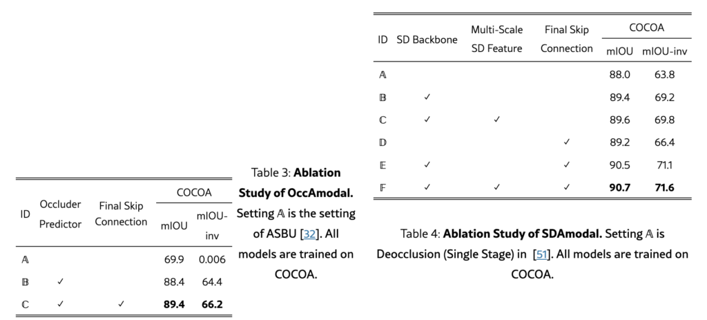 OccAmodal에 대한 Ablation Study에서는 Occluder Mask의 중요성과 Skip Connection의 효과를 분석하였습니다. Occluder Mask를 사용하지 않고 Amodal Mask를 예측한 경우보다 Occluder Mask를 포함했을 때 아래 표와 같이 성능이 크게 향상되었습니다. 또한, U-Net의 마지막 레이어에 Skip Connection을 추가한 경우에서는 결과가 더 개선되었습니다. SDAmodal의 Ablation Study에서는 Stable Diffusion Backbone이 기존 ResNet 인코더의 성능보다 좋은 점을 알 수 있었고, Multi-Scale Feature를 활용한 강점도 알 수 있었습니다. 마지막 레이어에 Skip Connection을 추가하는 것의 의미도 알 수 있었습니다.