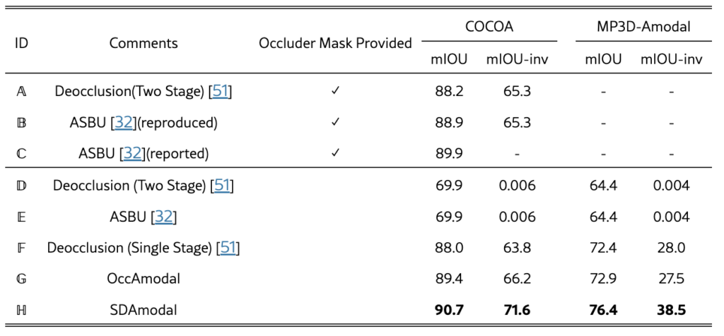 저자는 모델 성능 평가를 위해 COCOA와 MP3D-Amodal 데이터셋을 사용하였으며, 공정한 비교를 위해 비교에 사용한 Deocclusion, ASBU (Amodal Segmentation by Bottom-Up Completion)와 동일한 설정을 적용하였습니다. 평가 척도로는 Amodal Mask의 정확도를 나타내는 mIOU와 Occluded Region의 예측 정확도를 평가하는 mIOU-inv를 사용했다고 합니다. 일반적인 mIOU는 객체 전체에 대해 Ground Truth Mask와 예측된 Mask 간의 IOU를 계산하지만, mIOU-inv는 가려진 영역만을 대상으로 평가해서 모델이 가려진 부분을 얼마나 정확히 예측하는지 측정한다고 하네요.