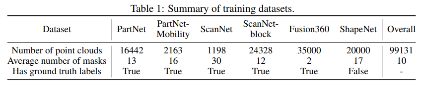FM은 일반적으로 많은 데이터를 사용하며 여기서는 다양한 segmentation 마스크의 존재가 중요합니다. 그래서 본 논문에서도 Tab.1과 같이 기존 데이터셋과 segmentation 라벨을 합쳐서 사용했다고 하네요. PartNet-Mobility의 경우 ShapeNet에 포함되지 않는 3개의 카테고리 (가위, 냉장고, 문)을 포함하고 있어서 unseen 카테고리에 대해 평가할 때 사용하였다고 합니다. object level로 제공되는 데이터셋들은 각 물체에 대해 12개의 뷰를 ㄹ네더링하고, 렌더링된 RGB-D 이미지에서 포인트를 합친 다음에 FPS를 사용해서 합쳐진 포인트에서 32768개의 포인트를 샘플링하였습니다. scene level의 데이터셋인 ScanNet200 같은 경우에는 scene을 block으로 나누어서 사용했다고 하네요 .. block 레벨이란게 정확히 뭔지는 모르겠지만 아마 더 작은 영역으로 나누어 object level과 유사해질 수 있도록 분할한 것이지 않을까 싶습니다.