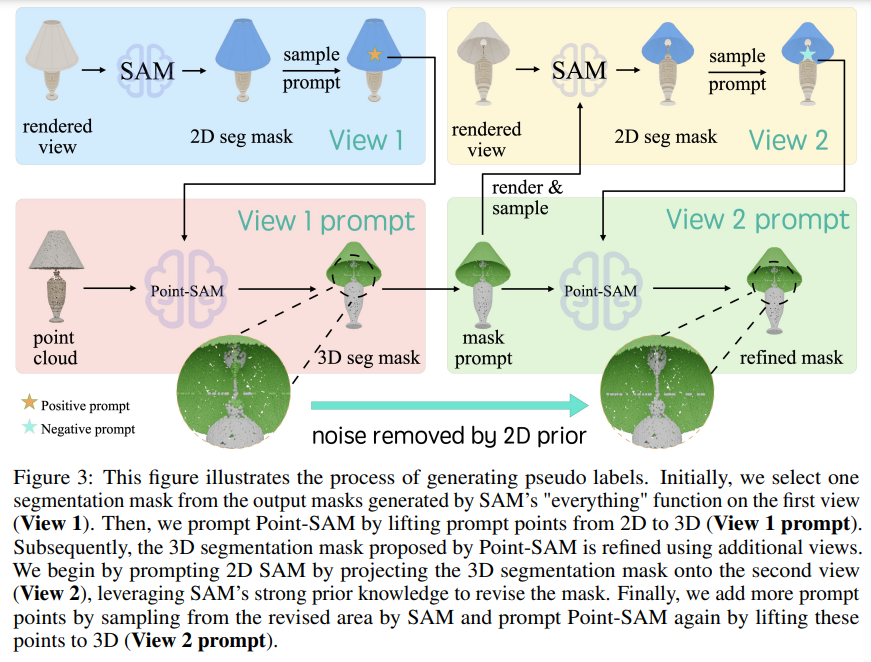 먼저 Point-SAM을 존재하는 데이터셋들을 합친 데이터로 사전학습 합니다. 그 다음에 그 사전학습된 Point-SAM과 SAM을 pseudo 라벨을 만들기 위해 함께 사용하게 됩니다. 각 메쉬마다 6개의 고정된 카메라 pose에서 RGB-D 이미지를 렌더링하고, 색깔이 있는 포인트 클라우드를 합칩니다. 그 다음에 Fig.3과 같이 SAM을 렌더링된 각 뷰에 대해서 다양한 2D mask proposal을 생성하고, 각 2D proposal에 대해서 해당하는 3D proposal을 찾아야 합니다.